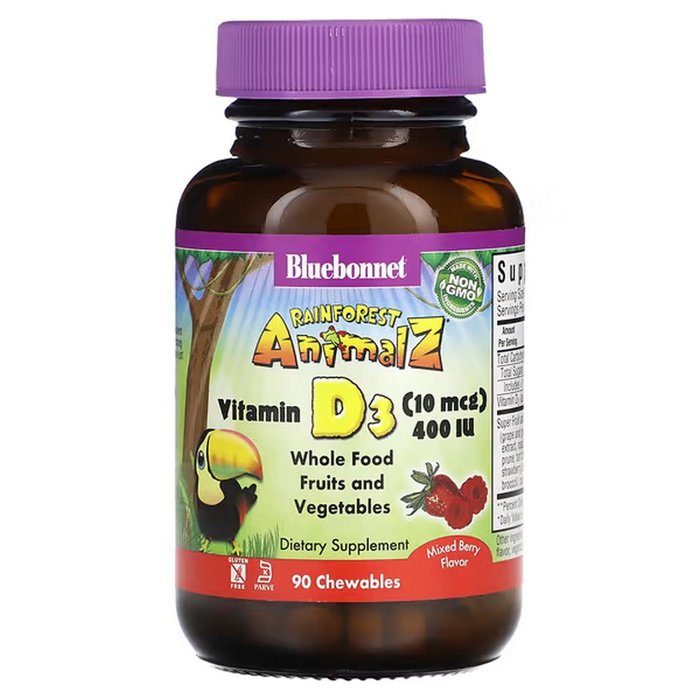 Bluebonnet Nutrition Rainforest Animalz Vitamin D3 400 IU Chewables provide essential vitamin D3 in a fun, animal-shaped chewable form designed especially for children. Each chewable contains natural cholecalciferol (vitamin D3) derived from lanolin to help support calcium absorption, strong bones, and a healthy immune system. Made with natural flavors and sweeteners, these chewables are free from artificial colors, preservatives, and common allergens.