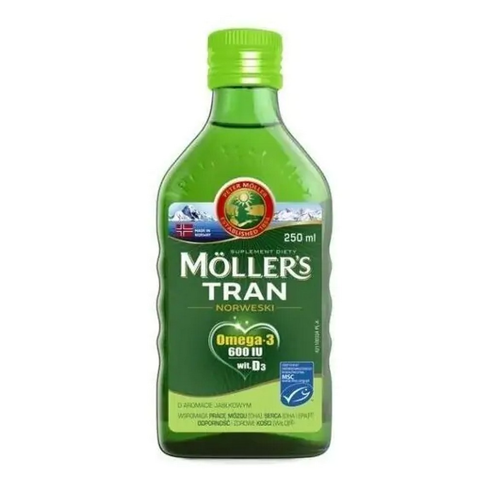 Apple-flavored cod liver oil rich in omega-3, vitamins A and D.