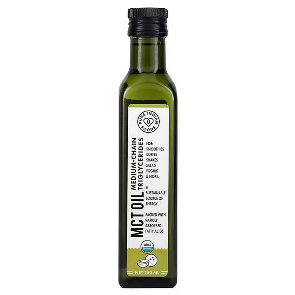 Pure Indian Foods MCT Oil is a premium dietary supplement made from high-quality coconut-derived medium-chain triglycerides (MCTs). These MCTs are rapidly converted into energy, supporting both physical performance and mental focus. The unflavored liquid oil is versatile and can be easily added to coffee, smoothies, or recipes for convenient daily use.